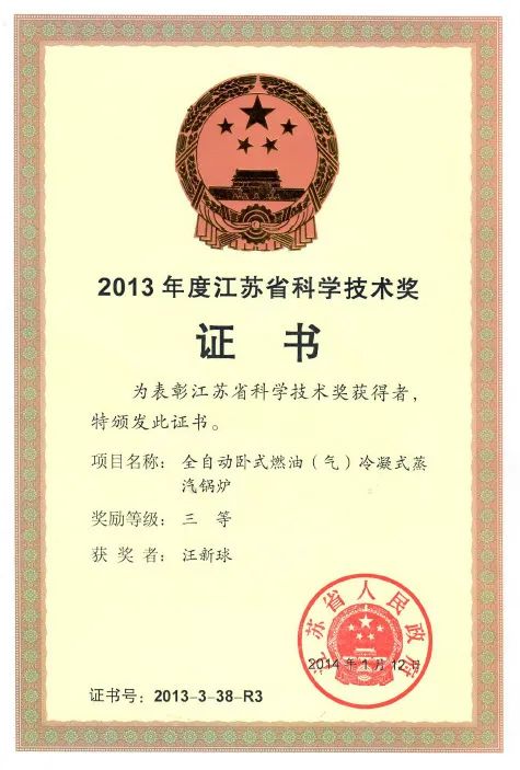 汪新球主導研發的臥式冷凝鍋爐獲得了江蘇省科技進步三等獎。